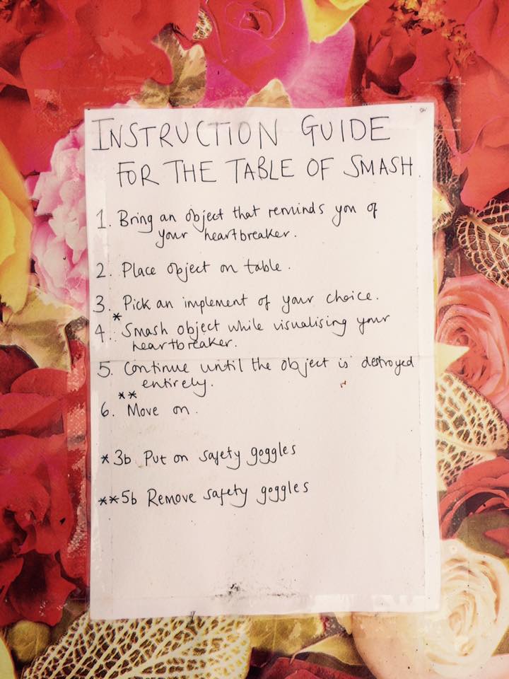 1. Bring an object that you can smash whilst thinking of someone who broke your heart.